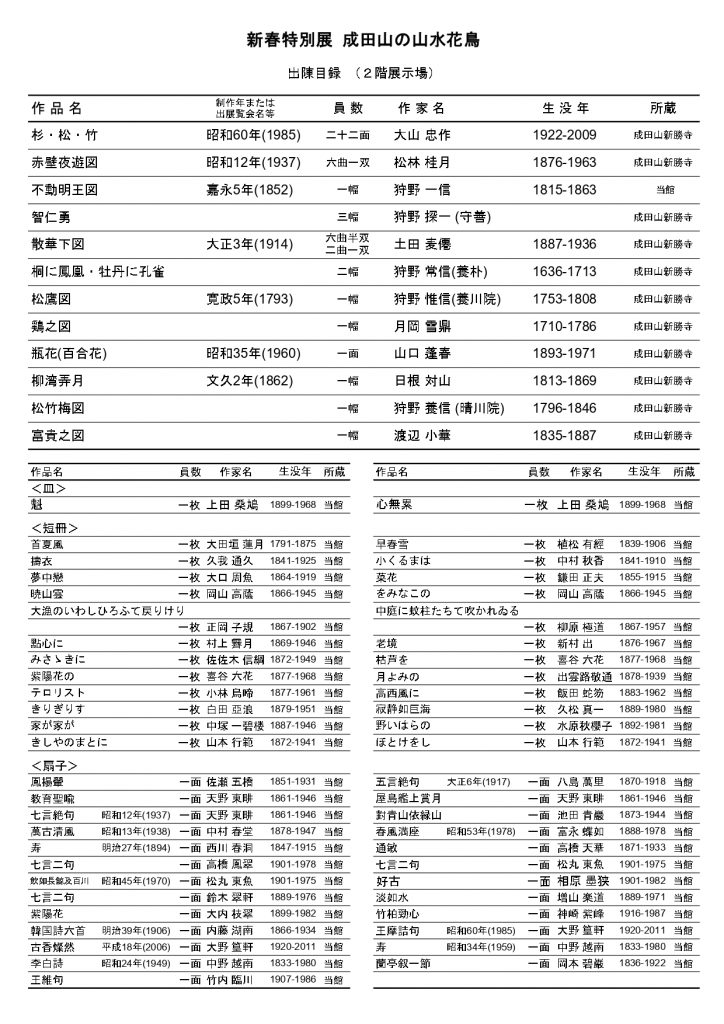 本展では、東洋美術として悠久の時を超えて描かれてきた「山水花鳥」の世界に注目します。そのモチーフは単なる装飾に留まらず、仏の教えや悟りに通じるものへと昇華され、日本人の感性と風土が融合した独自の美術を生み出してきました。描かれる多くのモチーフが幸福のシンボルを内包しています。初詣とともに、成田山の聖域に秘められてきた深遠な「山水花鳥」の世界をご体感ください。