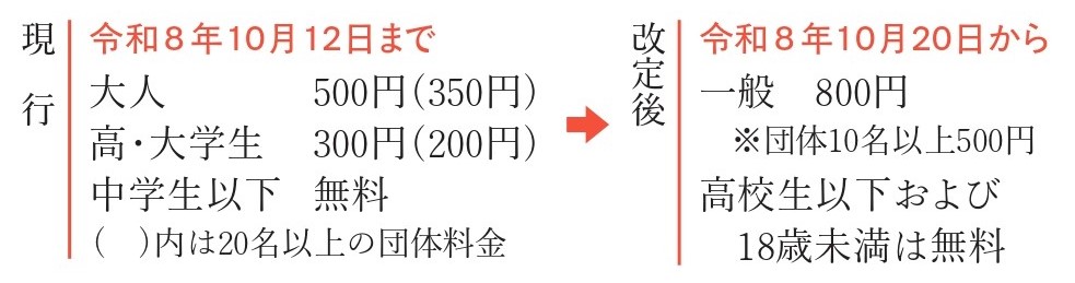 このたび、昨今の物価上昇に伴う物流・光熱費の値上げなどを受け、令和8年10月20日より入館料を以下のとおり改定いたします。